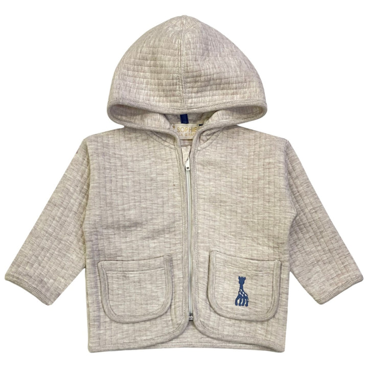 Black zip-up hoodie for baby boys by Sophie la Girafe, featuring an embroidered logo, printed detail, front pockets, and ribbed trims for a comfy, stylish look.