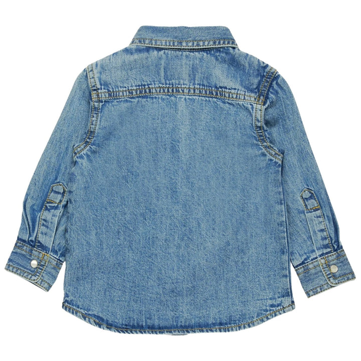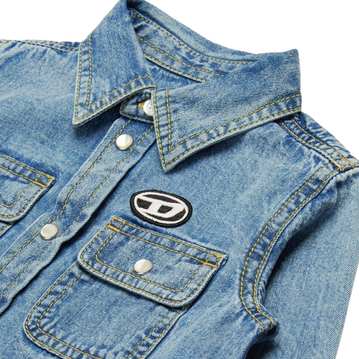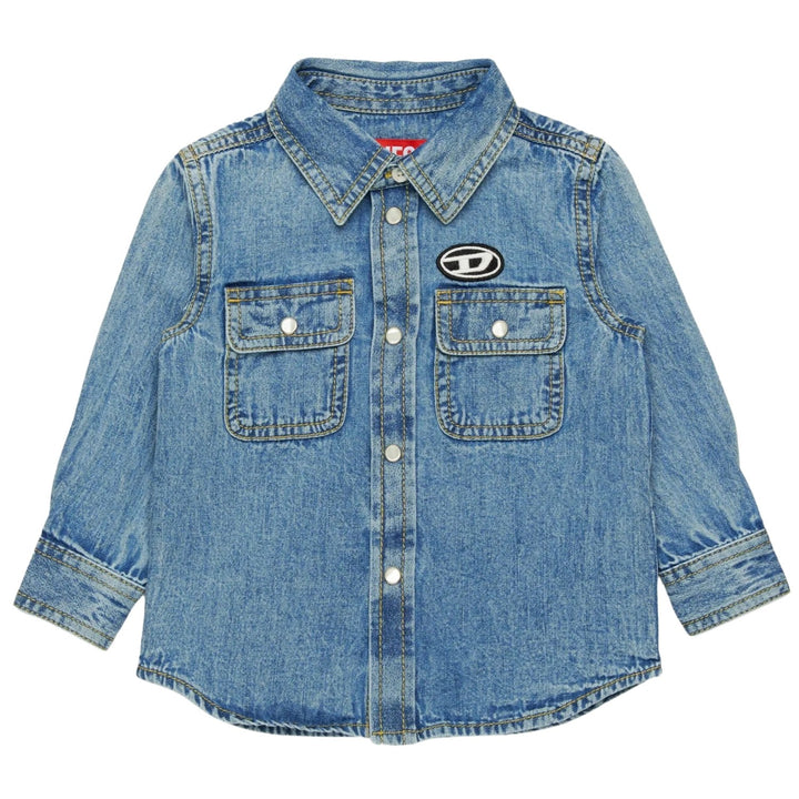 Long-sleeved shirt in light blue denim. Button closure. Breast pockets. Features an Iconic Oval D logo patch on the front heart side. Color contrasting seams.