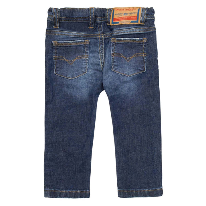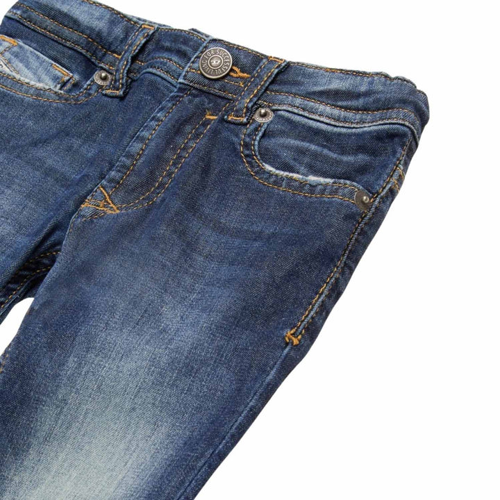 Five-pockets skinny fit jeans. Made of dark blue denim with a soft vintage effect, distinguished by gradients, whiskers and contrasting coloured seams. Small abrasions along the pockets and on the bottom.