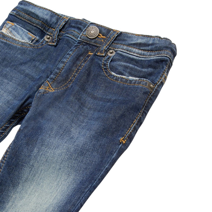 Five-pockets skinny fit jeans. Made of dark blue denim with a soft vintage effect, distinguished by gradients, whiskers and contrasting coloured seams. Small abrasions along the pockets and on the bottom.