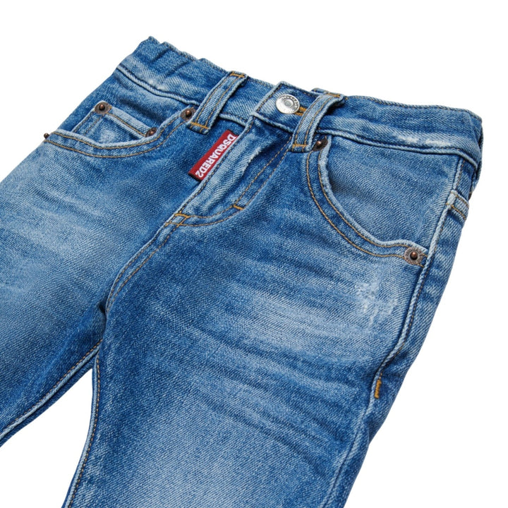Five-pockets jeans. Made of medium blue denim, distinguished by contrasting colour gradients, whiskers and small abrasions. Turn-up bottom hem with inside-out effect. Dsquared2 label applied to the flap (flag logo).