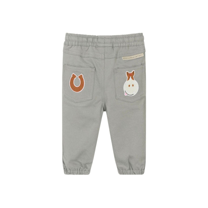 Cute grey cotton trousers for baby boys by Stella McCartney Kids, featuring playful horse motifs on the back pockets. They have a stretchy drawstring waist for comfort. The Stella McCartney fit can be quite small so choose a size up if you want room to grow.