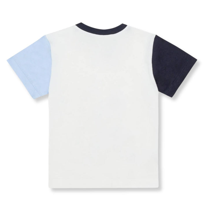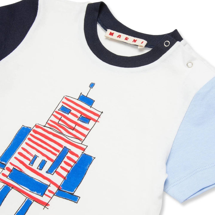 This ivory cotton T-shirt from Marni Kids features a bold graphic print on the front with a logo accent for a signature touch. Designed with a crew neck, short sleeves, and convenient press-stud fastening at the shoulder, it ensures both style and ea