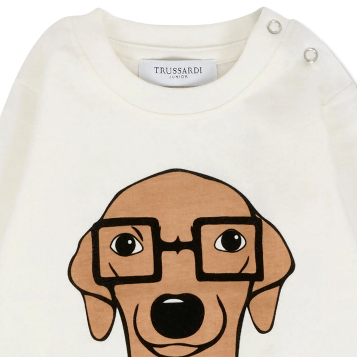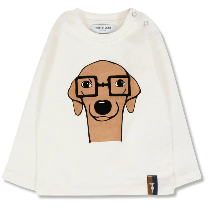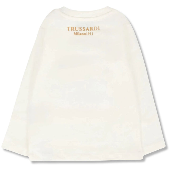 A soft ivory T-shirt for baby boys featuring a stylish logo patch on the chest. Crafted from breathable cotton, perfect for everyday comfort and a clean, modern look.