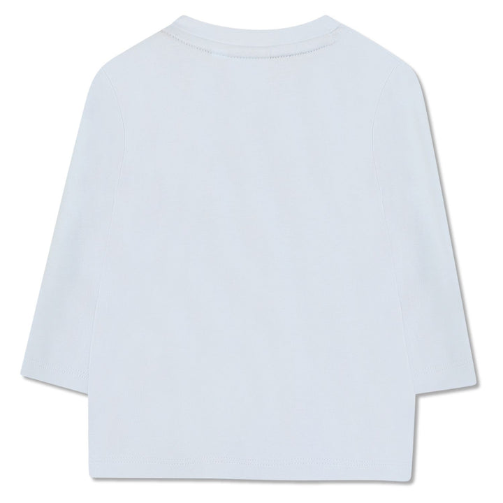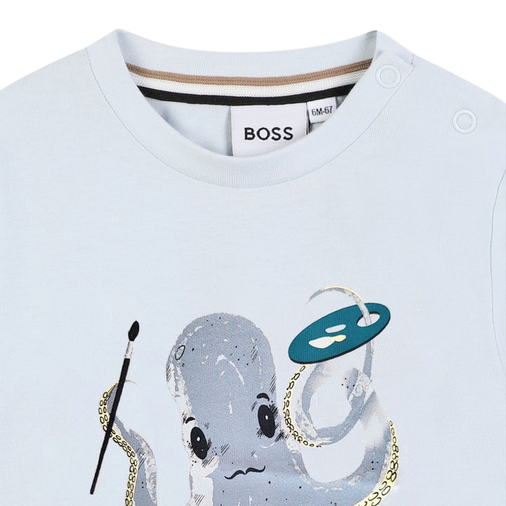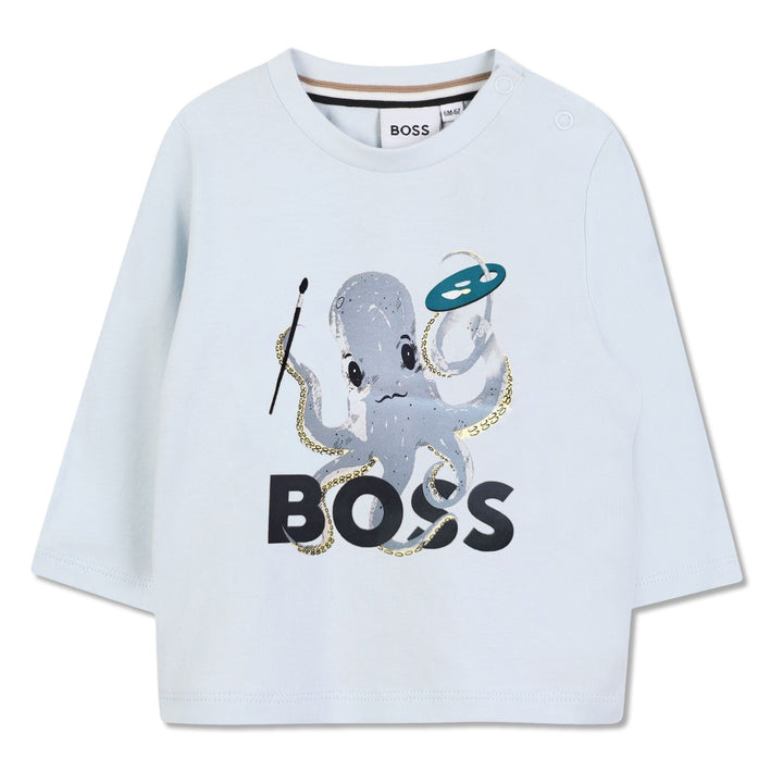 This light blue long sleeve T-shirt from BOSS features a fun and creative graphic of an octopus holding a drumstick and cymbal, with the bold "BOSS" logo printed underneath. Made from soft and comfortable fabric, it offers a playful design perfect for kids, combining artistic flair with everyday comfort. The shirt’s unique illustration adds a lively touch to casual outfits.Name: BOSS Kids Octopus Print T-shirt