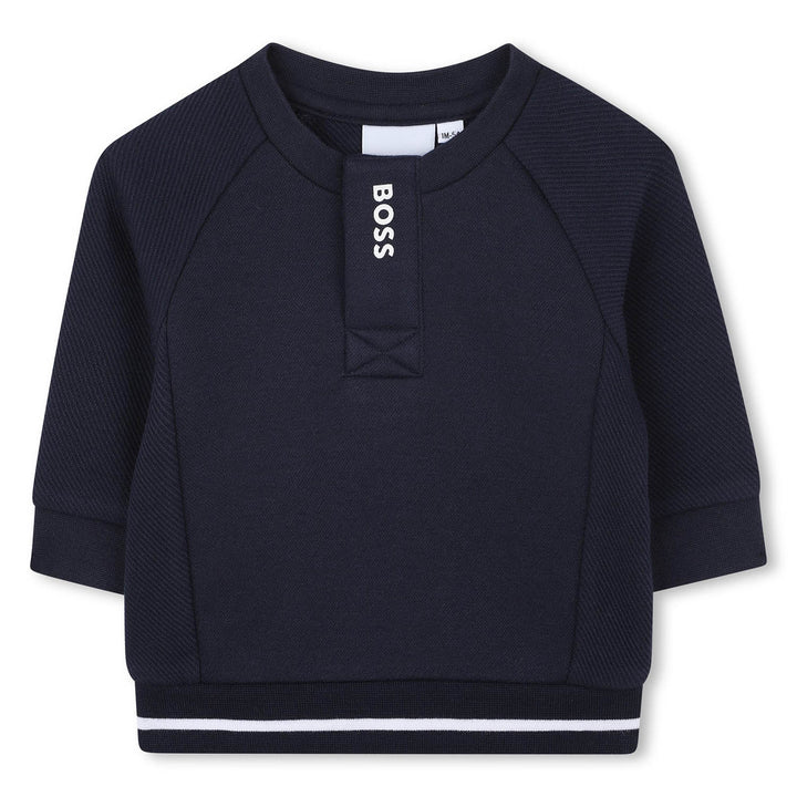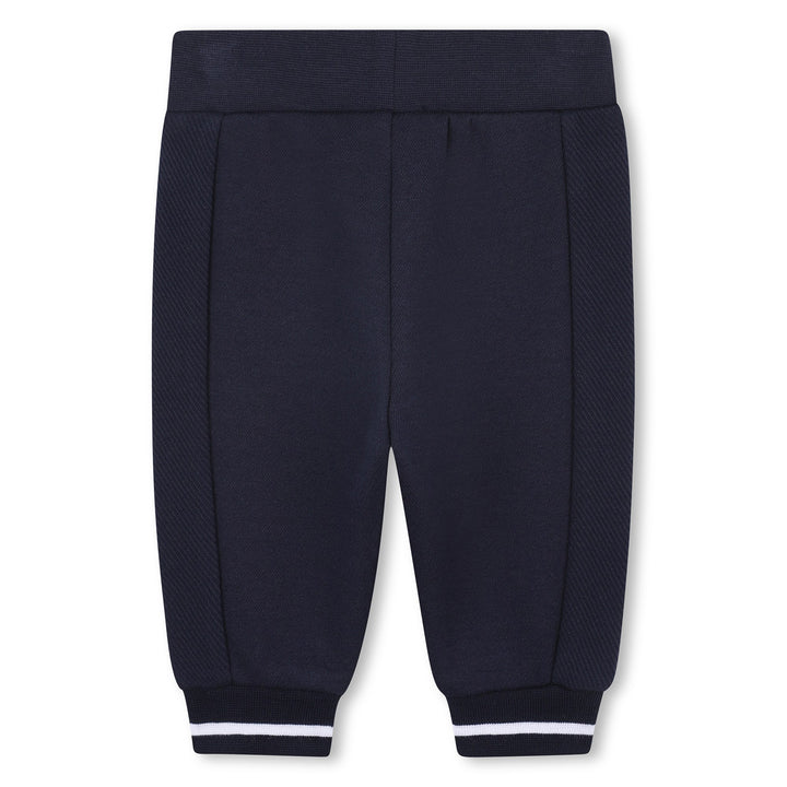 Casual and comfortable for baby boys, this navy blue tracksuit by BOSS is made in soft organic cotton jersey. The crew neck top has a concealed popper placket on the front, while the joggers have a gently elasticated waistband for ease of movement. Both pieces have bold white logos and matching striped trims. Coming in a branded box, it makes an ideal gift for a new arrival.
