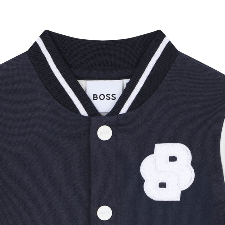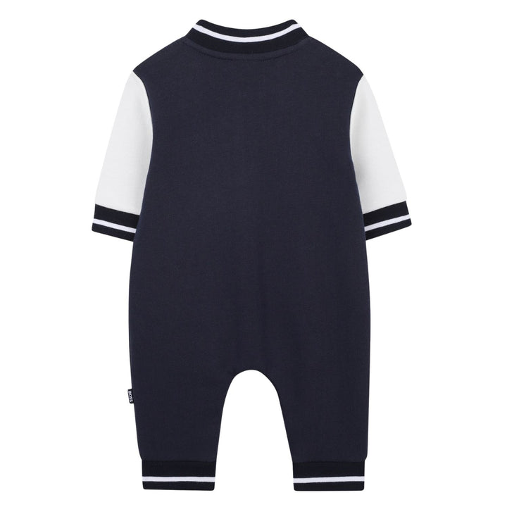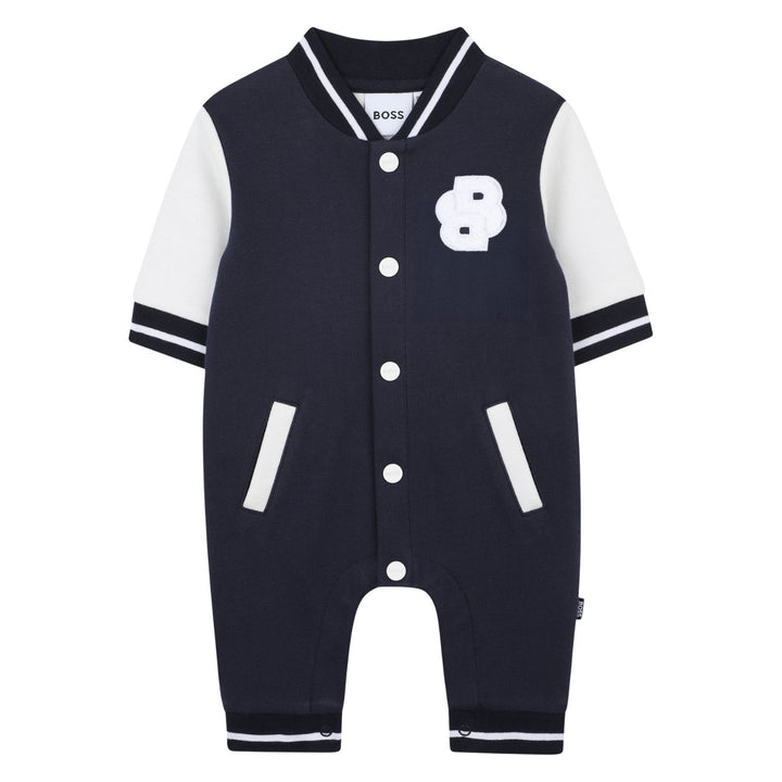 A navy blue romper for baby boys by BOSS, made in mid-weight organic cotton jersey. In a sweet varsity style, it has contrasting white sleeves and stretchy ribbed trims. The brand's Double B monogram appliqué adds instant designer appeal and it fastens neatly with branded poppers.