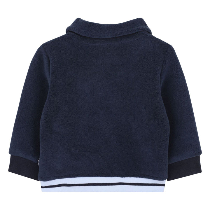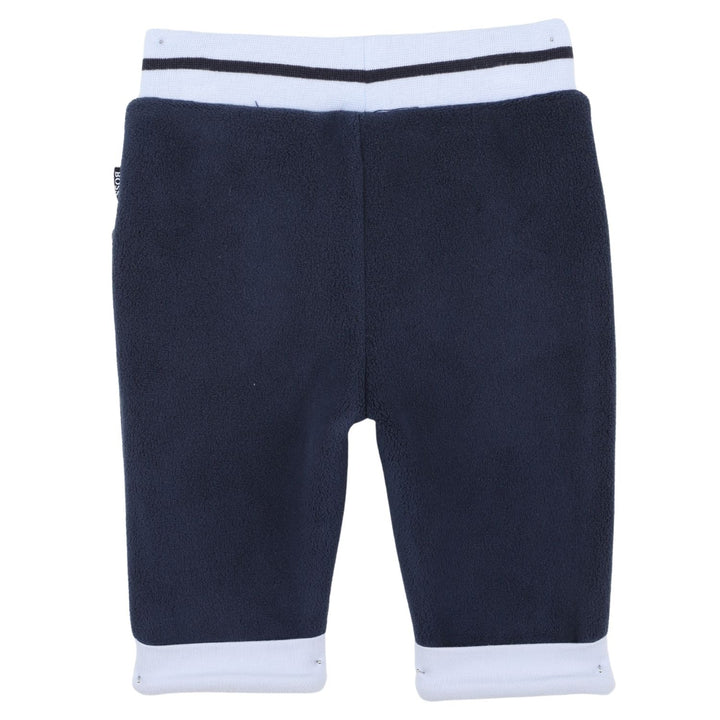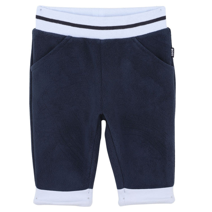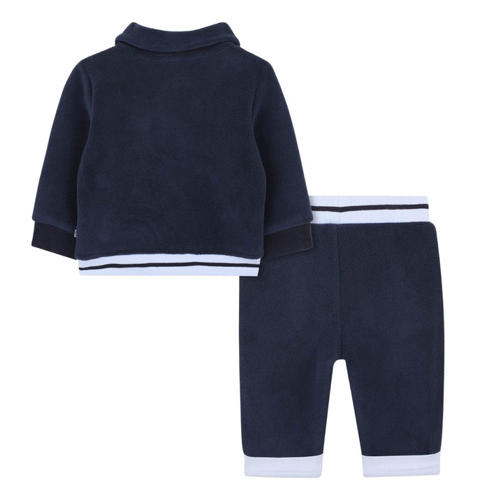 Casual navy blue tracksuit for baby boys by BOSS, made in soft and cosy fleece. Ideal for the cooler months, the jacket fastens easily with branded poppers. It has pale blue trims and a distinctive Double B monogram logo appliqué on the chest. The matching trousers have slanted front pockets and a gently elasticated waistband for a comfortable fit. Coming in a branded box, it makes an ideal gift for a new arrival.