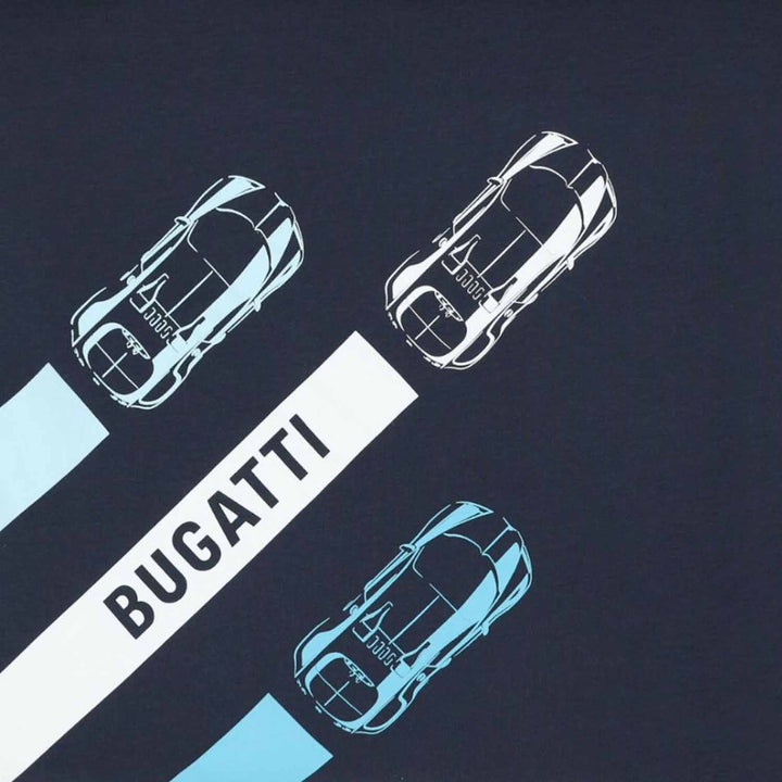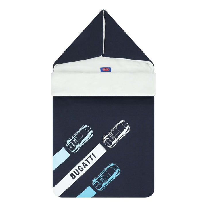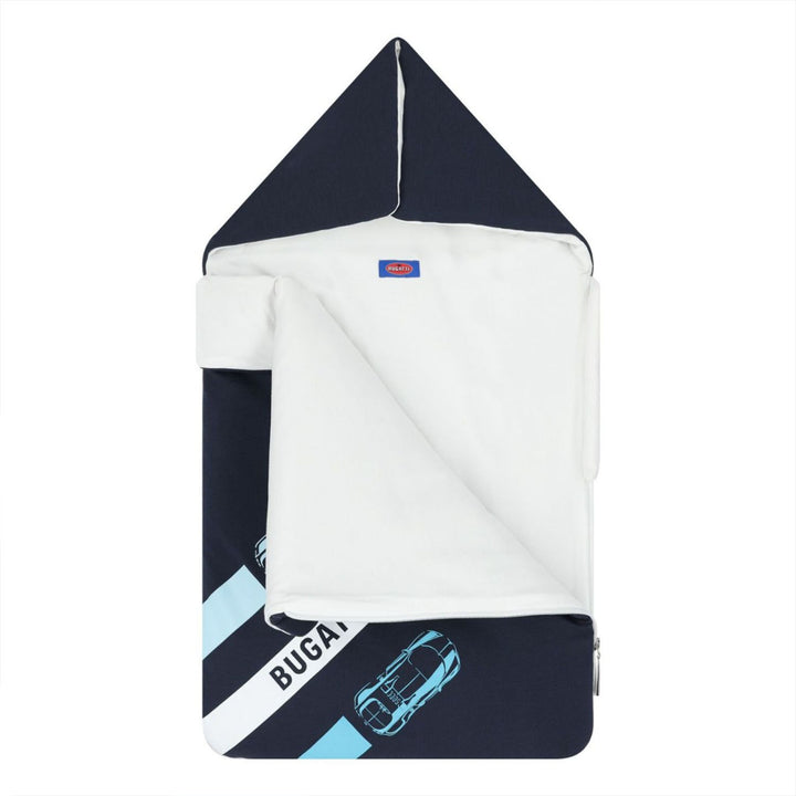 Navy blue nest for baby boys by Bugatti Junior. Made from soft cotton, it features the brands logo, a thick line detail and sports car print in aqua and white on the front Fastens down one side and at the bottom with a zip and poppers at the hood. Ma