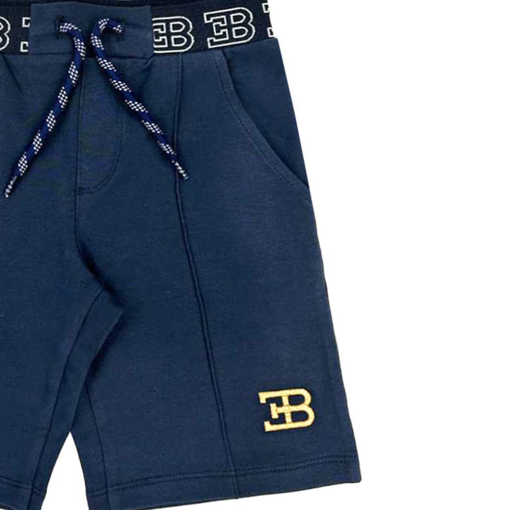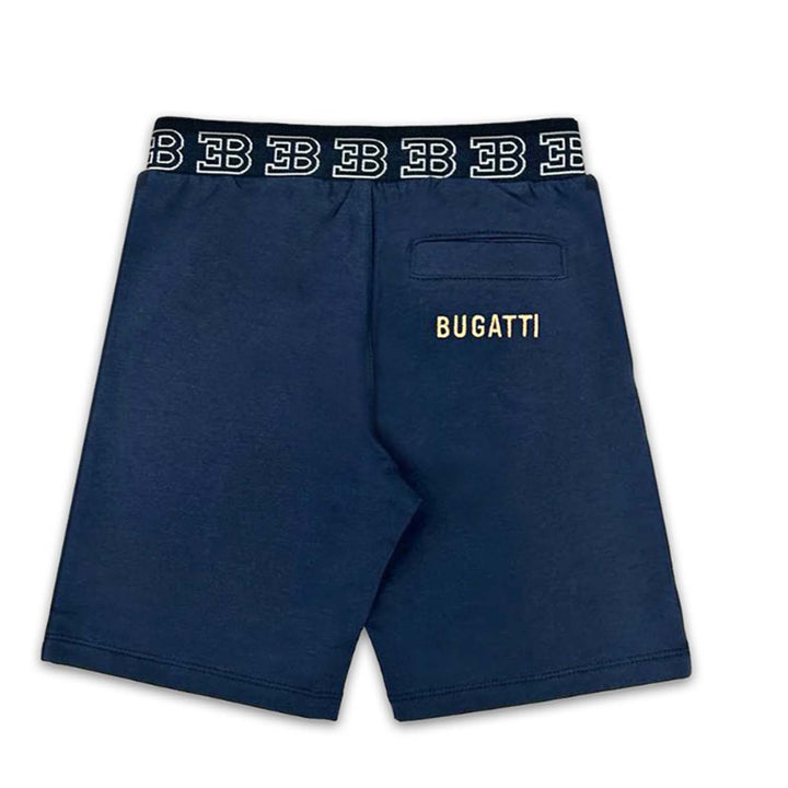Navy blue logo shorts for boys by Bugatti Junior. Made from soft cotton. Features the embroidered brand logo in metallic gold on the front and at the back. They have a three pocket styling. Finished an elasticated logo waistband and drawstring for co