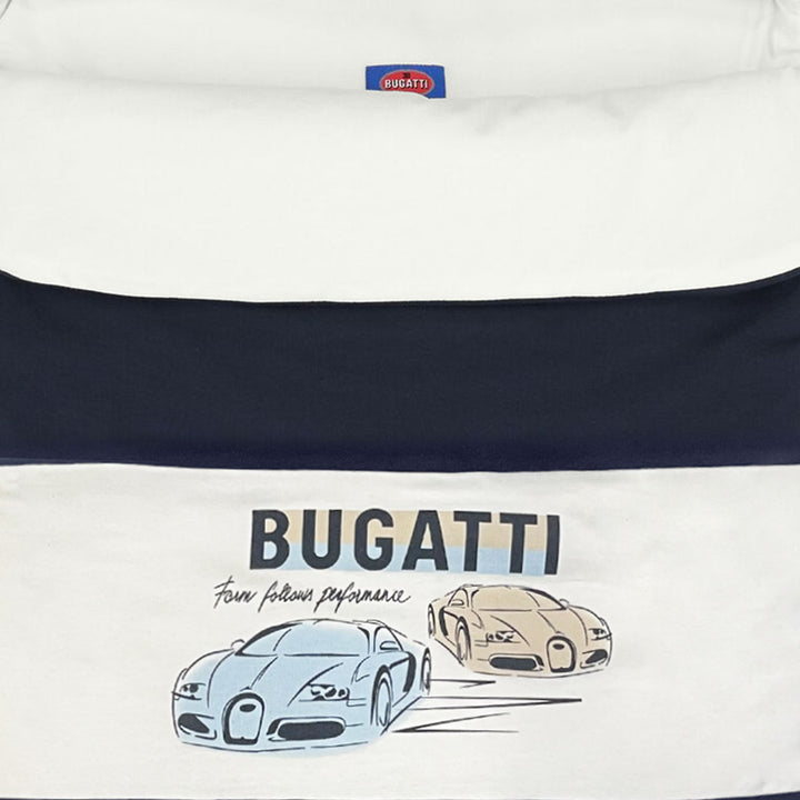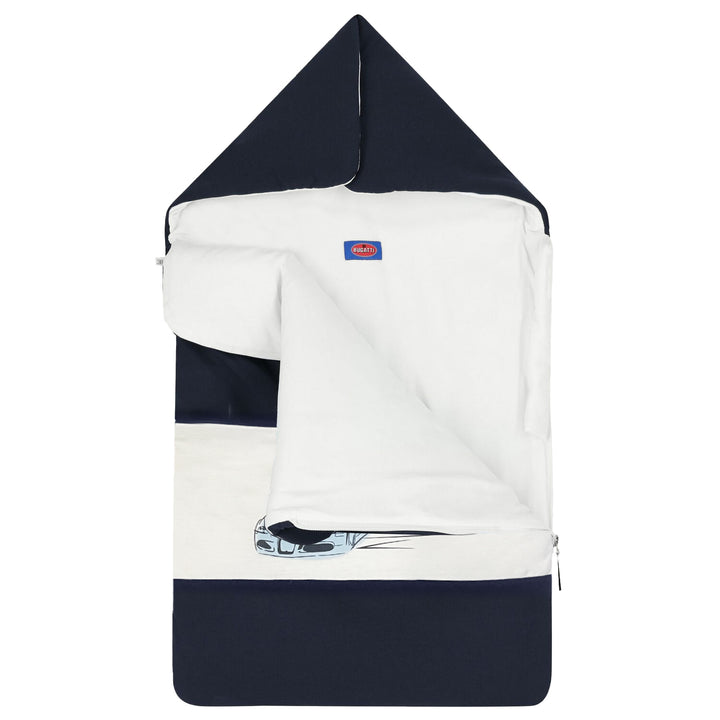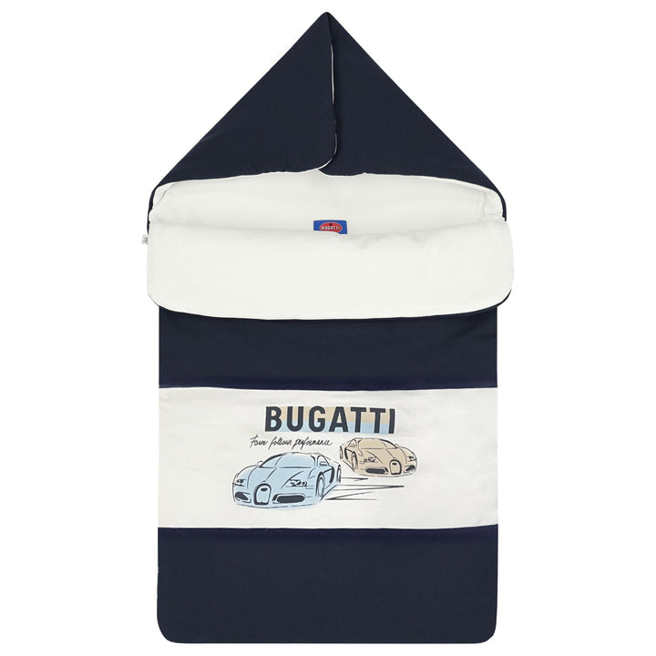 This Bugatti Baby Nest features a stylish navy blue and white design with signature logo prints. Crafted from soft cotton with light padding, it ensures comfort and warmth. The zip-around closure allows for easy dressing and convenience.