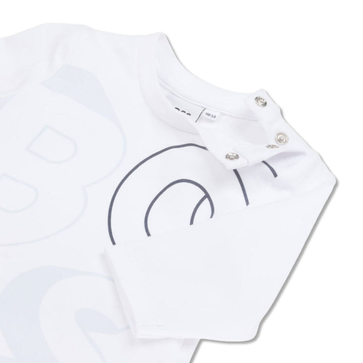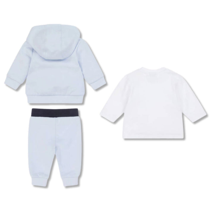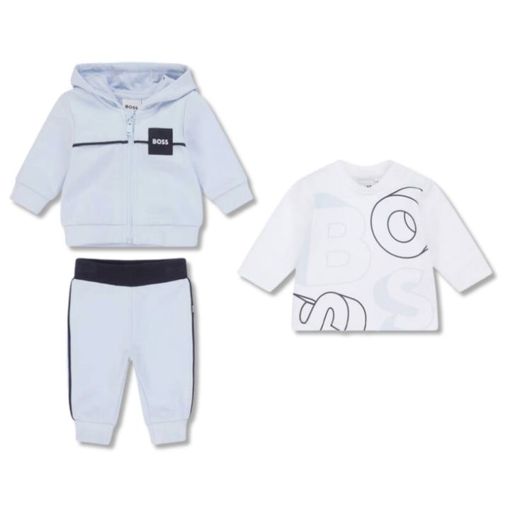 Pale blue cotton jersey tracksuit set for baby boys by BOSS, with contrasting navy blue trims. The tracksuit is soft and fleecy on the inside, and consists of a zip-up hoodie and comfortable joggers. It comes with a long-sleeved top with a bold logo design printed on the front and poppers on one shoulder for speedy dressing.