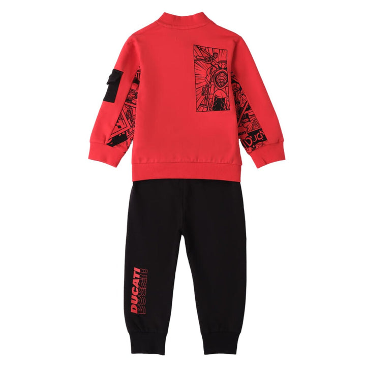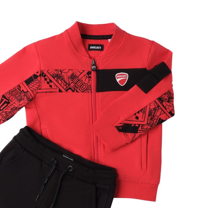 Kids Ducati tracksuit with a bold red zip-up hoodie featuring graphic detailing and black joggers with logo perfect for sporty comfort.