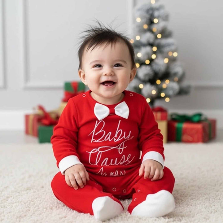 Baby Boys Red Personalised Baby Claus Rompers add a cute festive touch with their bright red color and personalized Christmas design. Crafted from soft, gentle fabric, this romper keeps your little one cozy and comfortable, perfect for holiday celebrations and family photos.