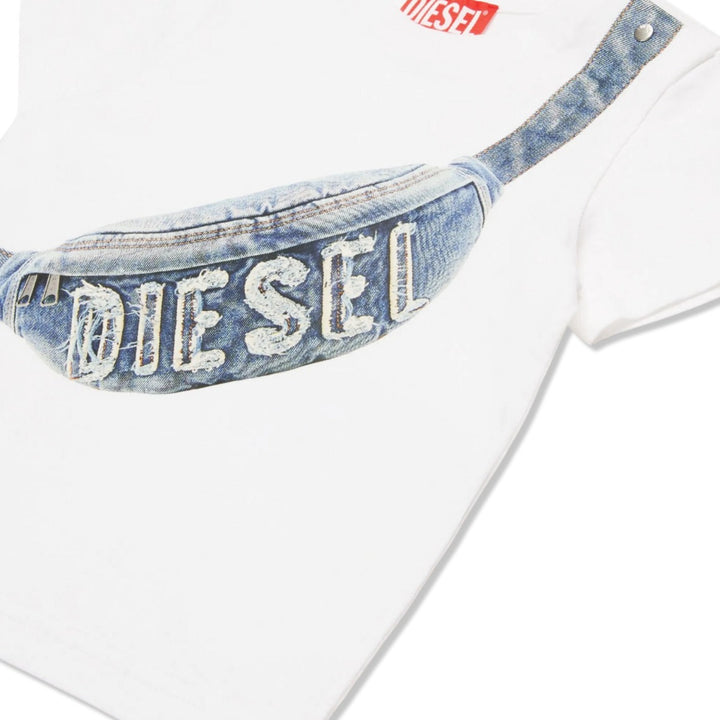 Short-sleeved crew-neck T-shirt in jersey. Features a Diesel Hip Pack trompe-oeil print on the front. Practical button closure on the shoulder. Made of 100% cotton.