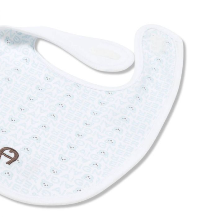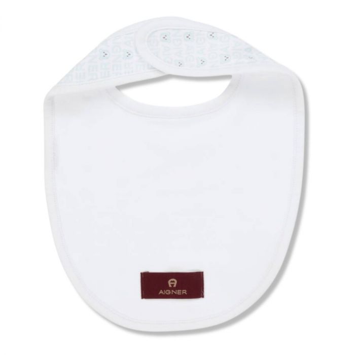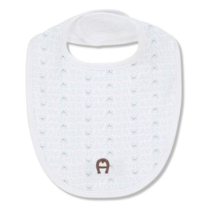 White and blue baby bib for baby boys by Aigner. Made from soft cotton jersey. This bib features the brands name along with a teddy bear face print pattern. It fastens with Velcro at the back for a secure fit. Matching items are available to purchase separately.