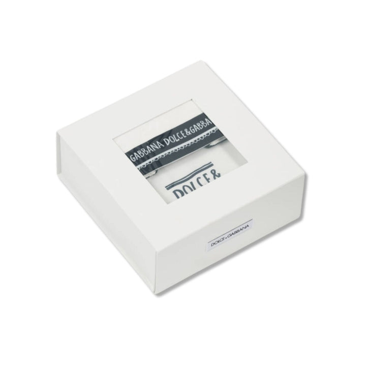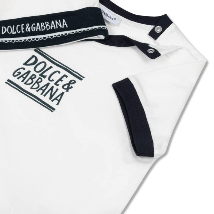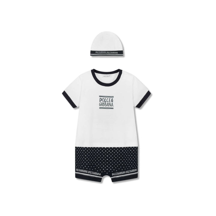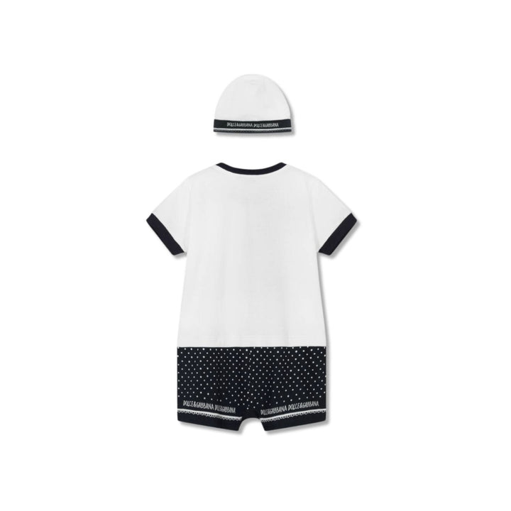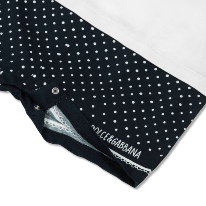 Adorable off-white and navy blue shortie and hat set for baby boys by luxury Italian designer Dolce & Gabbana, presented in a charming gift box. Made in soft jersey, the cute design features lovely polka dots and bold logo branding. The babysuit has practical poppers while the hat is made in a double layer for added cosiness.