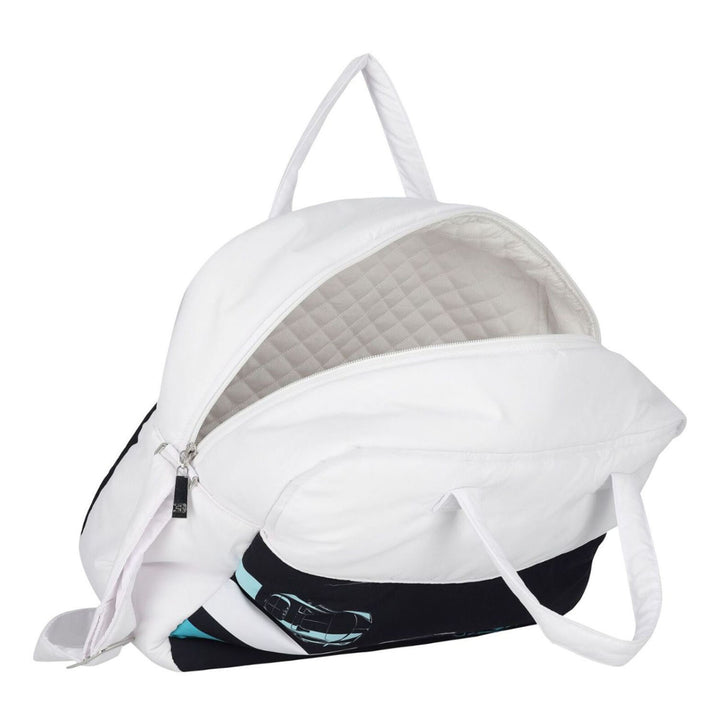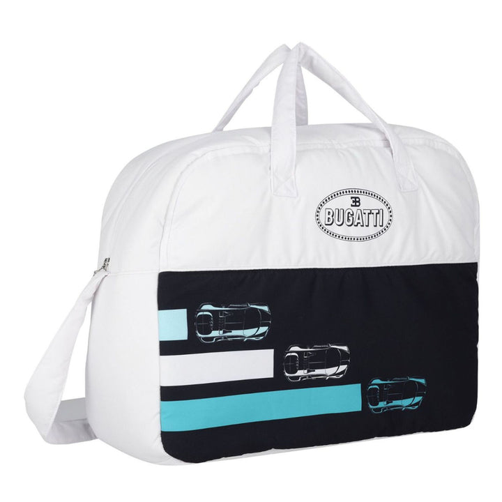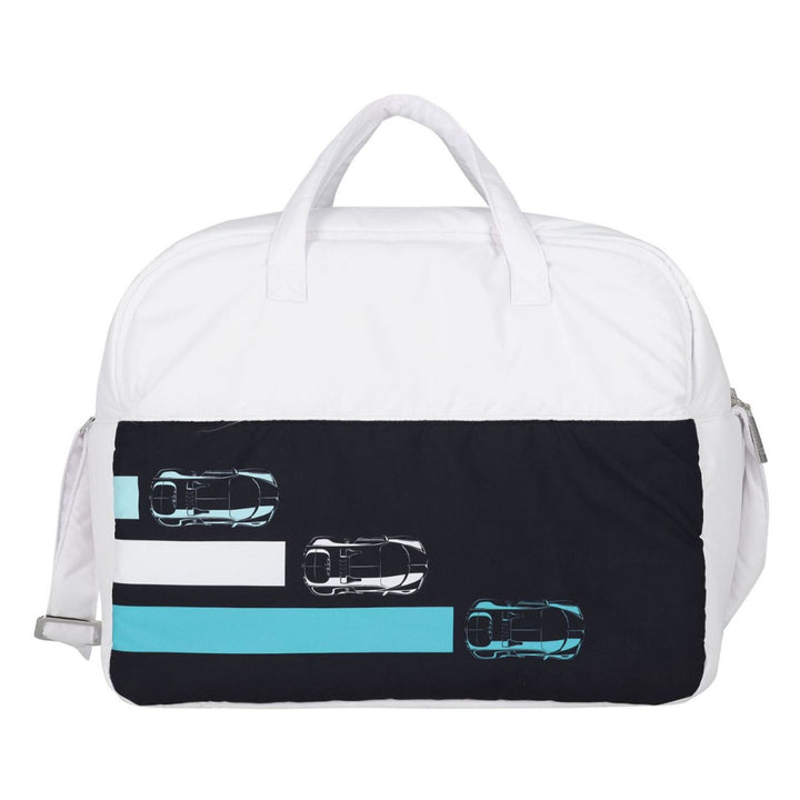 White and navy blue mommy bag for baby boys by Aigner. Made from lightweight polyester with a quilted cotton lining. It features the brands logo, a thick line detail and sports car print in aqua and white on the front. The changing bag includes two c