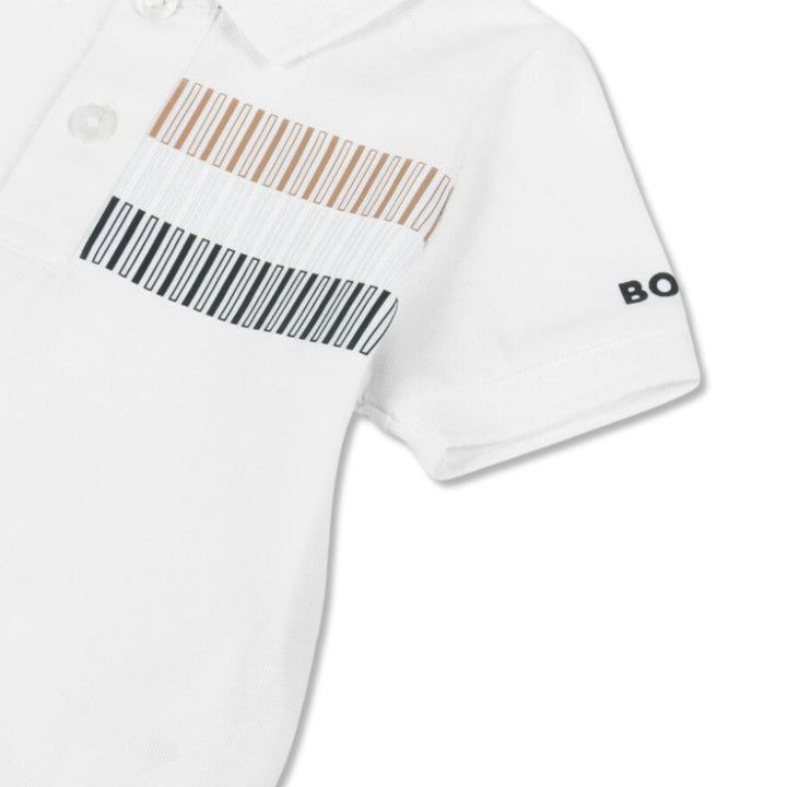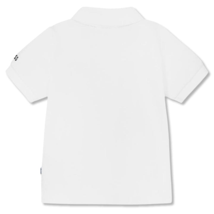 From BOSS, a white polo shirt for baby boys made in stretchy cotton pique. This classic top has the brand's signature striped detailing on the chest and a logo print on the arm for a designer finish.