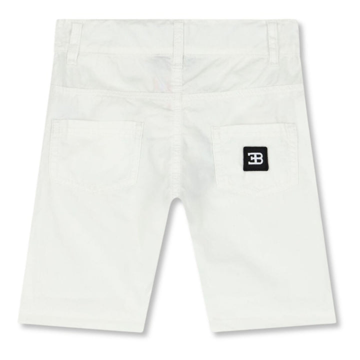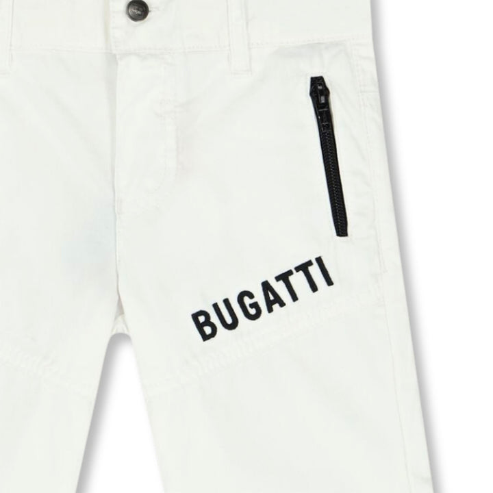 White logo shorts for baby boys and younger boys by Bugatti Junior. Made form soft cotton. It features the embroidered brand logo in black and patch embroidered logo at the back. It has a dual zipped pockets on the front and dual pocket at the back.