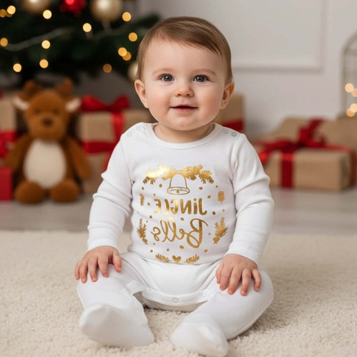 Baby Boys White Jingle Bells Print Rompers add a playful festive charm with their cute jingle bells print and soft white fabric. Designed for comfort and easy movement, this romper is perfect for Christmas celebrations, family photos, and cozy holiday moments.