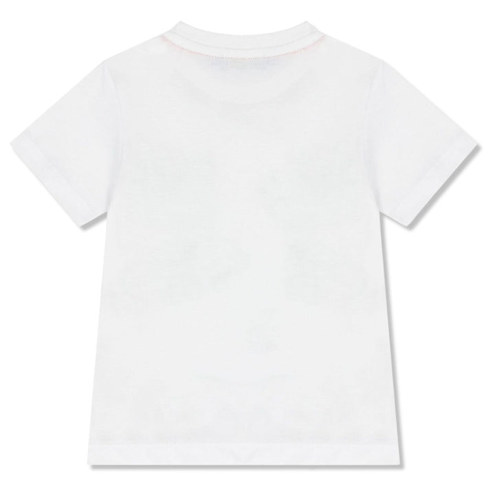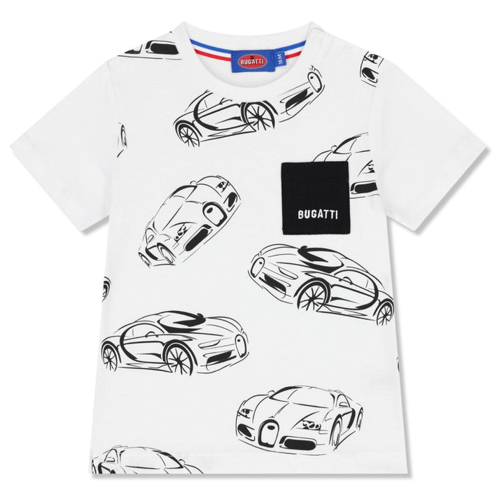 White t-shirt for baby and baby boys by Bugatti Junior. Made from soft cotton jersey, it features sports car printed pattern in black. It has black chest pocket with the brands logo embroidered in white. Fastens with poppers on one shoulder for easy dressing.
