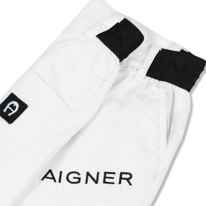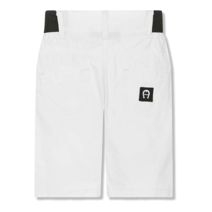 White cotton Bermuda shorts for baby boys by AIGNER, made in lightweight cotton. They have elasticated jacquard logo inserts for a comfortable fit on the waist, and fasten with a button. Complete with four useful pockets, they have an embroidered logo on the front and the signature 'A' horseshoe can be seen on the back.