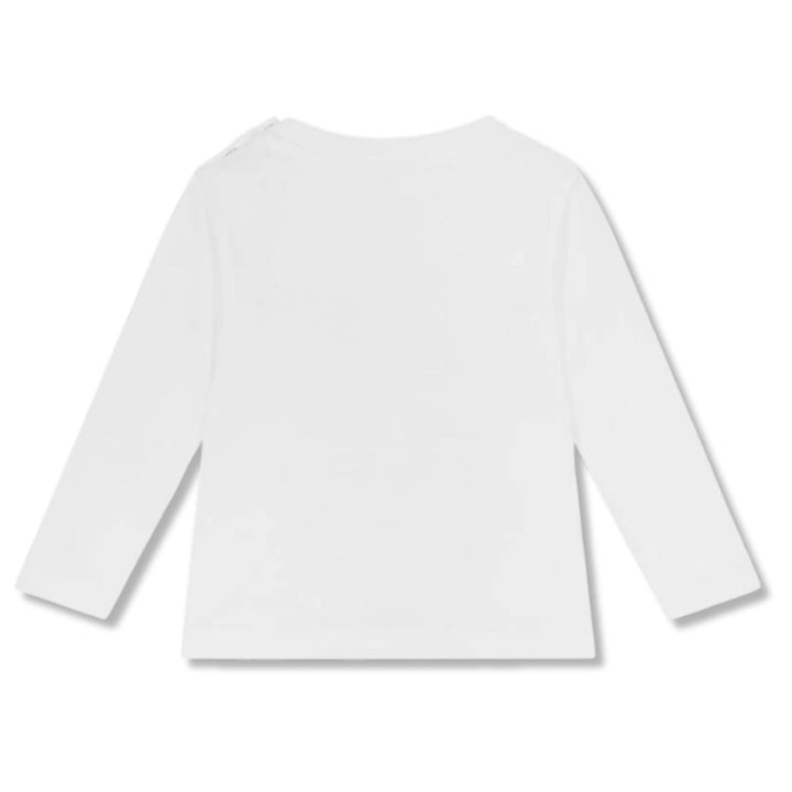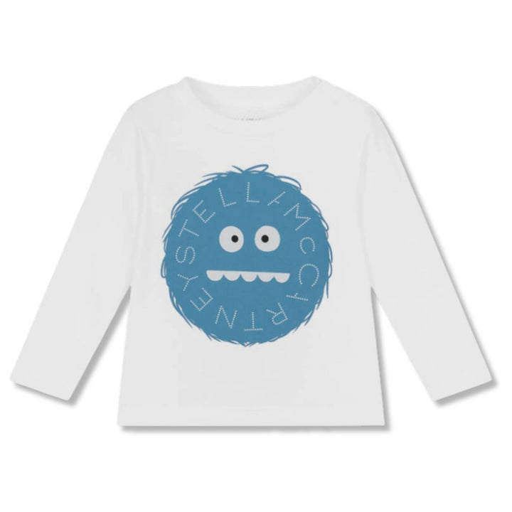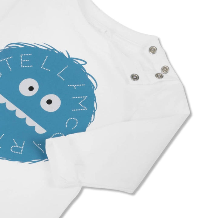 A comfortable, white long-sleeved top for little boys by Stella McCartney Kids. Made in soft and stretchy organic cotton jersey, it has a big, blue yeti logo print on the front and useful poppers on one shoulder.