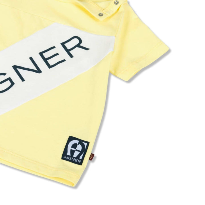 Yellow T-shirt for baby boys by AIGNER, made in soft and stretchy cotton jersey. It has a bold white stripe across the front with a navy blue logo for instant brand recognition. There is a logo patch by the hem featuring the signature 'A' horseshoe logo and popper fastenings on one shoulder to help with dressing.