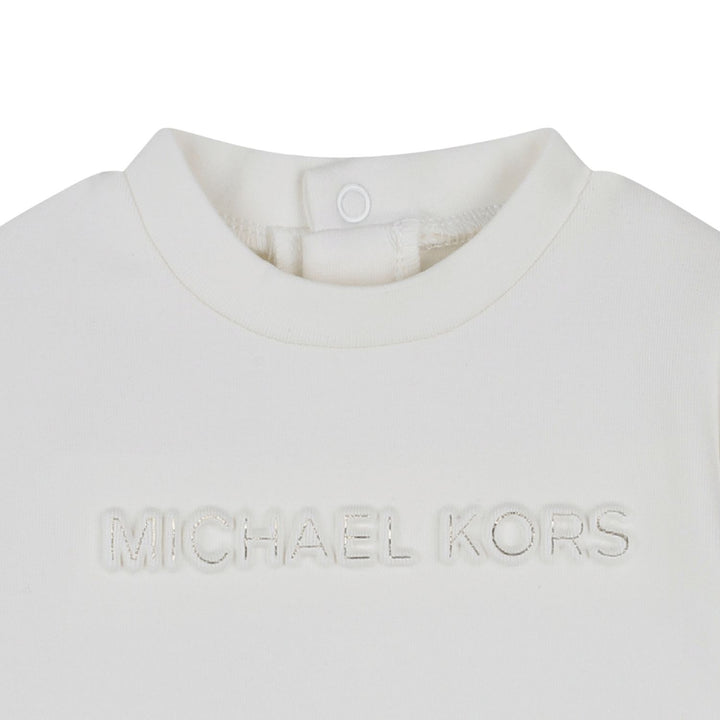Baby Girls White Logo-Patch Flared Dress This white flared dress features a stylish logo patch and is made from a soft, stretchy blend of 77% Cotton, 16% Polyester, and 7% Elastane, offering comfort and a playful look for any occasion.