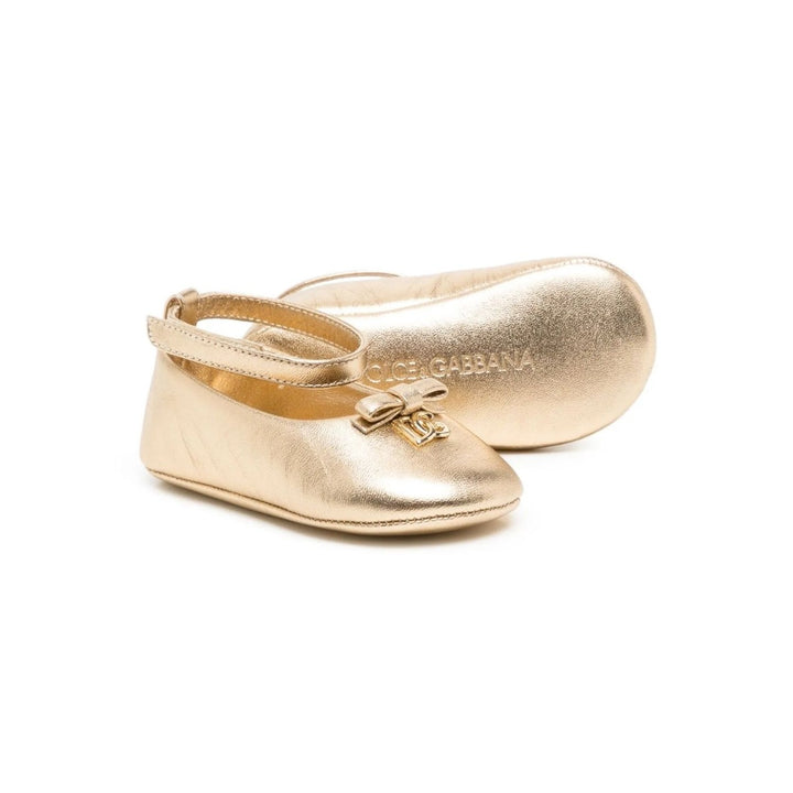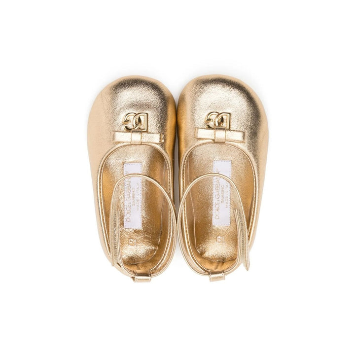 Baby girls gold pumps by luxury brand Dolce & Gabbana. They are made and lined in soft leather, with a velcro strap, brown rubber sole and sparkly diamante DG logo on the front.