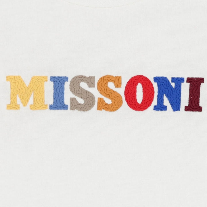 Baby Girls ivory logo-print T-shirt by Missoni made from soft, breathable cotton and adorned with the brands iconic colorful logo across the front, offering a perfect blend of comfort and contemporary style.