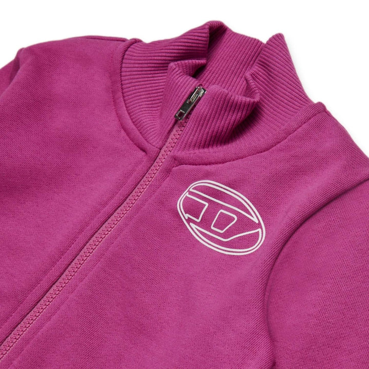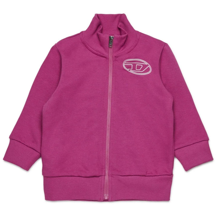 Diesel baby girl pink zip-up sweatshirt with a signature logo patch. Made from 100% cotton for a soft, cozy feel. A cute and comfy layer for everyday wear.