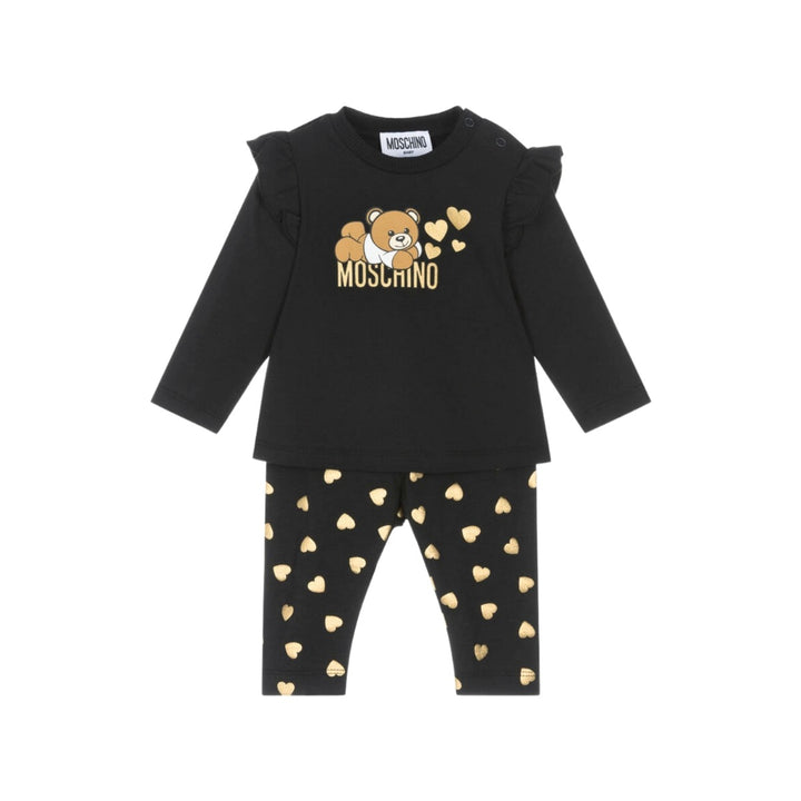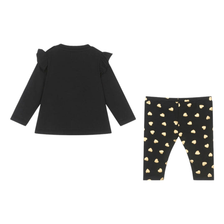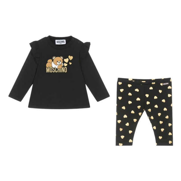 Black leggings set for little girls by Moschino Baby, made in soft and stretchy cotton jersey. The long-sleeved top has pretty ruffle trims over the shoulders and a gold and white Moschino Teddy Bear logo on the front with glittery gold hearts. There