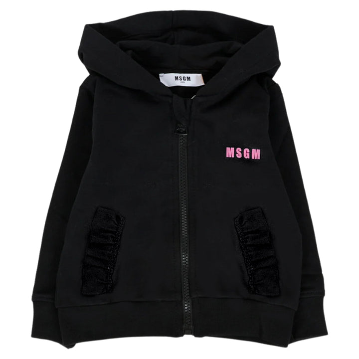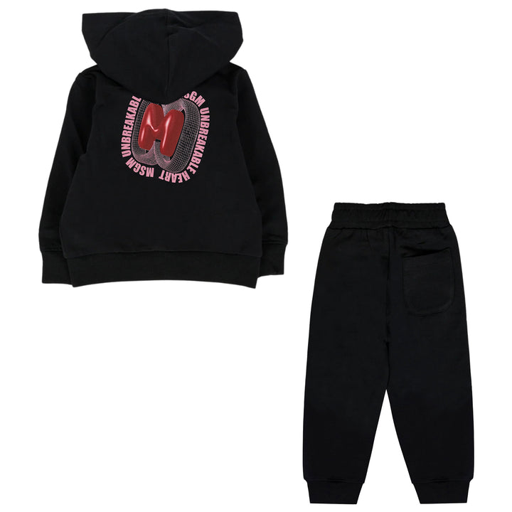 Baby Girls Black Zip Up Logo Print Tracksuit crafted from soft and cozy fabric for gentle all day comfort. Featuring a stylish zip up jacket with a bold logo print and matching bottoms with an elastic waistband, this tracksuit offers an easy, comfortable, and trendy look perfect for playtime or outings.