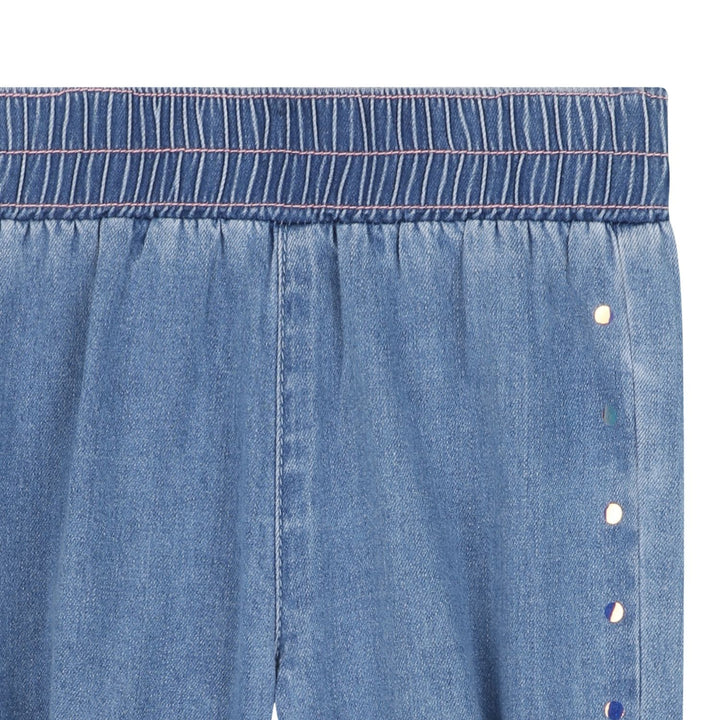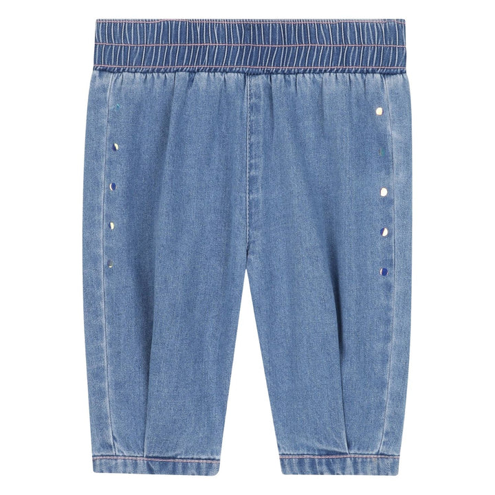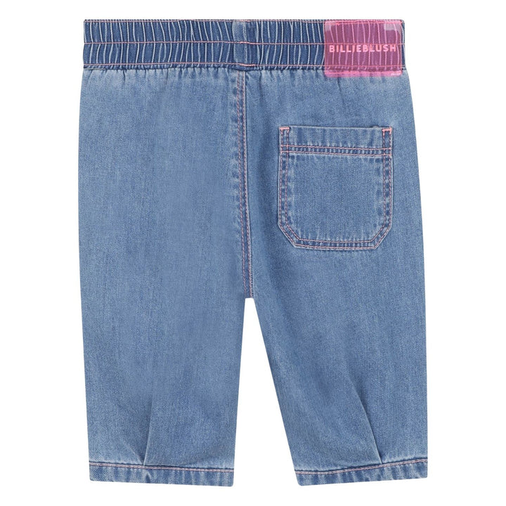 Baby Girls Blue Denim Trousers made from 1% cotton, offering a soft and comfortable fit for everyday wear.