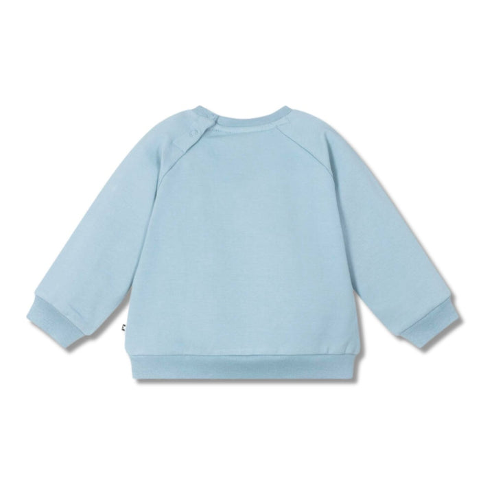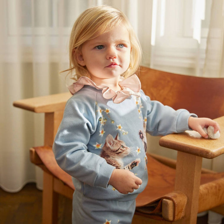 A dusky blue sweatshirt for little girls by Molo, with raglan long sleeves. Made from soft mid-weight organic cotton jersey, it has a fleecy interior for added cosiness and practical popper fastenings on one shoulder. Printed on the chest are two cute kittens playing with star-shaped flowers for a fun look.