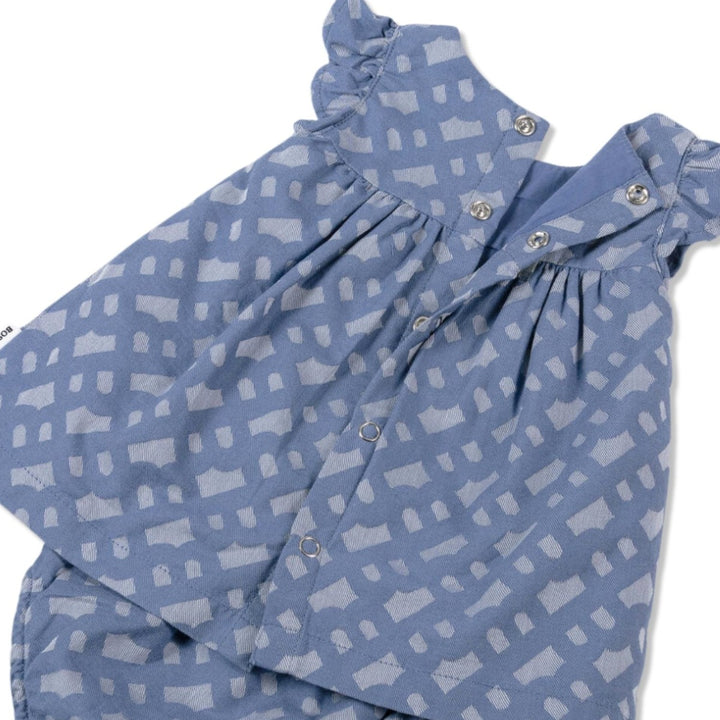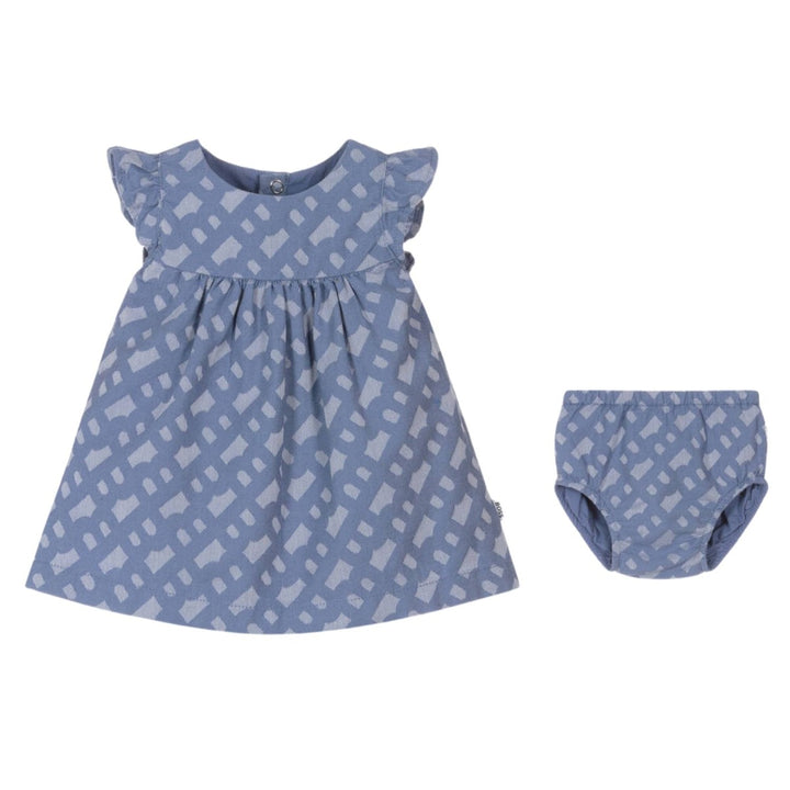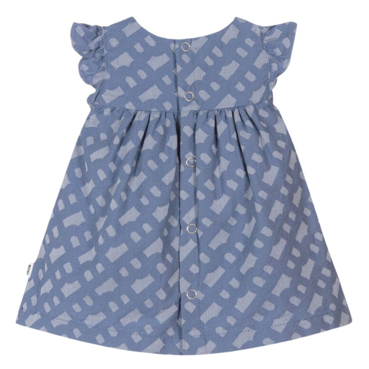 Cute blue dress for baby girls by BOSS, woven in beautifully soft cotton twill with the brand signature monogram pattern. Fully lined for comfort, this sleeveless style has pretty ruffles on the shoulders, gathers from the bodice, and simple popper fastenings on the back. It comes with a pair of matching knickers to complete the look.