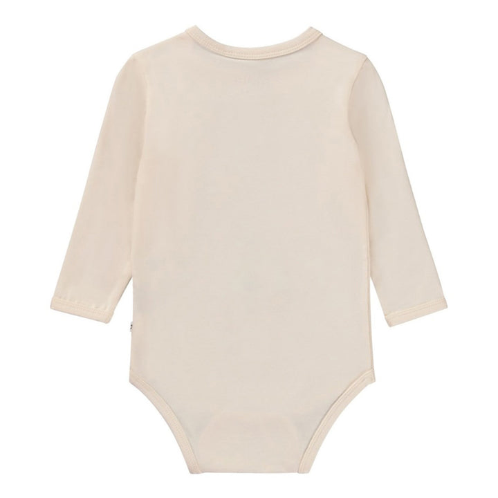 Rose coloured baby bodysuit with a print of a group of bunny friends on the front. This bodysuit is in 1% cotton, has long sleeves and easy snap closure at the neck and between the legs. Wear the bodysuit with the Seb pull on trousers in the same pri