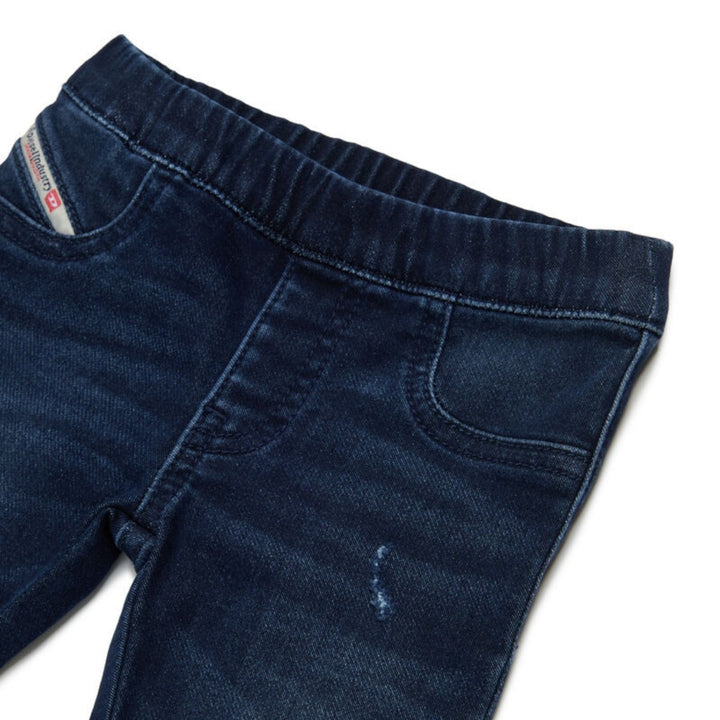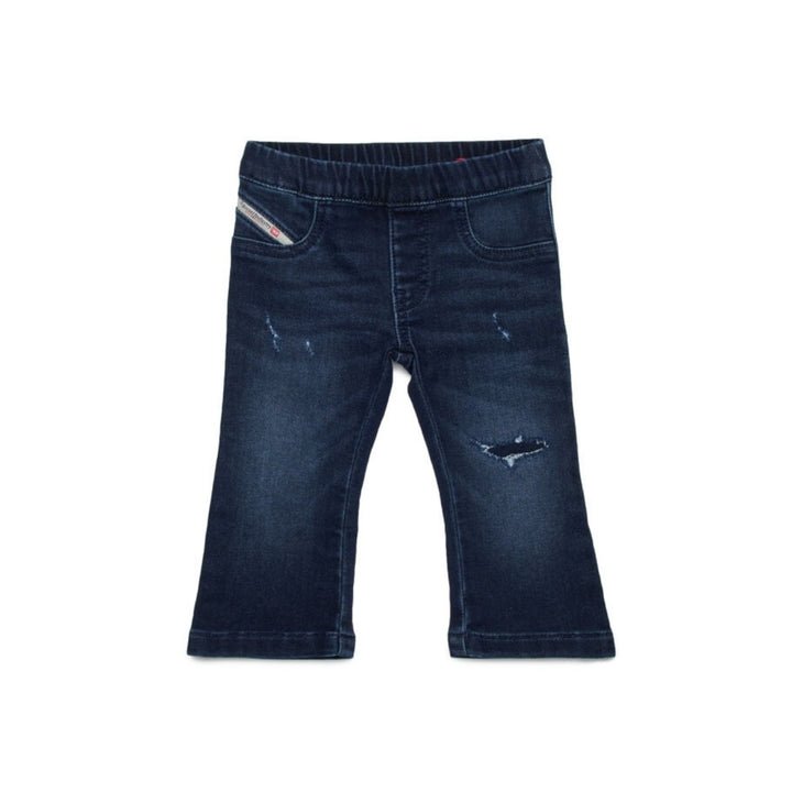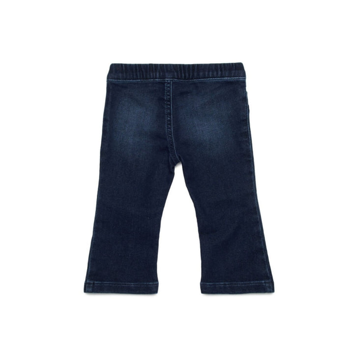 Flared style with an elasticated waist. These baby jeans are crafted from JoggJeans denim for the utmost comfort, characterised by whiskers, small abrasions and patched breaks with zig-zag stitching