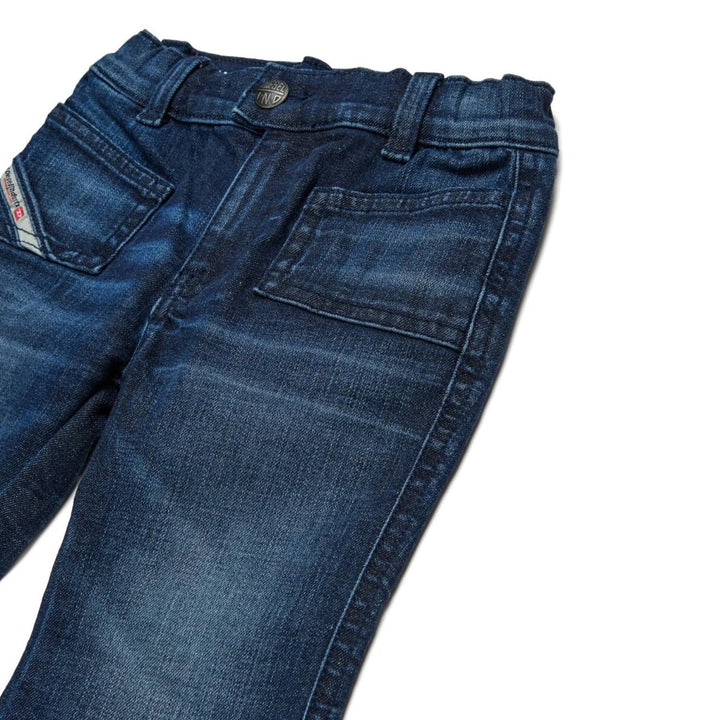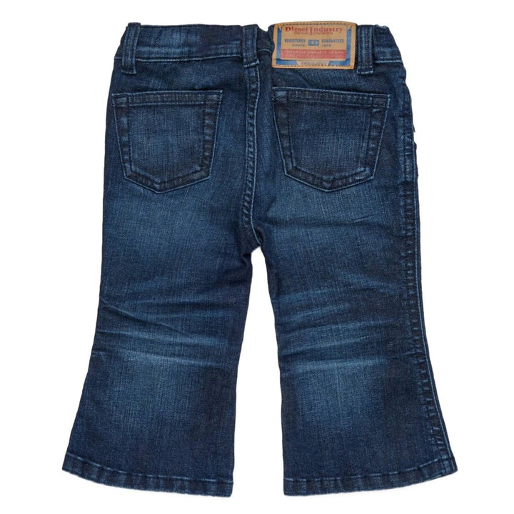 Diesel baby girls wide-leg jeans in classic blue denim. Made from 98% cotton and 2% elastane for softness and flexible comfort. A stylish pick for little trendsetters.
