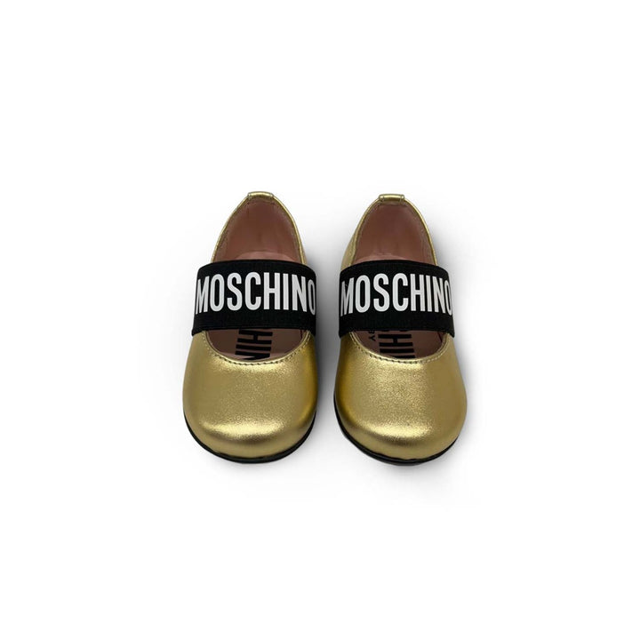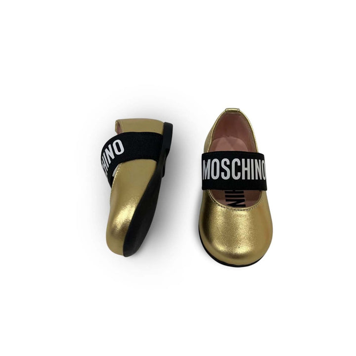Metallic gold pre-walker shoes for girls by Moschino Baby, made with luxury soft and supple leather. These ballerina-style shoes have the Moschino appliqués on the front for a cute look. There is a black logo print on the vel