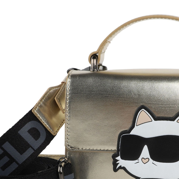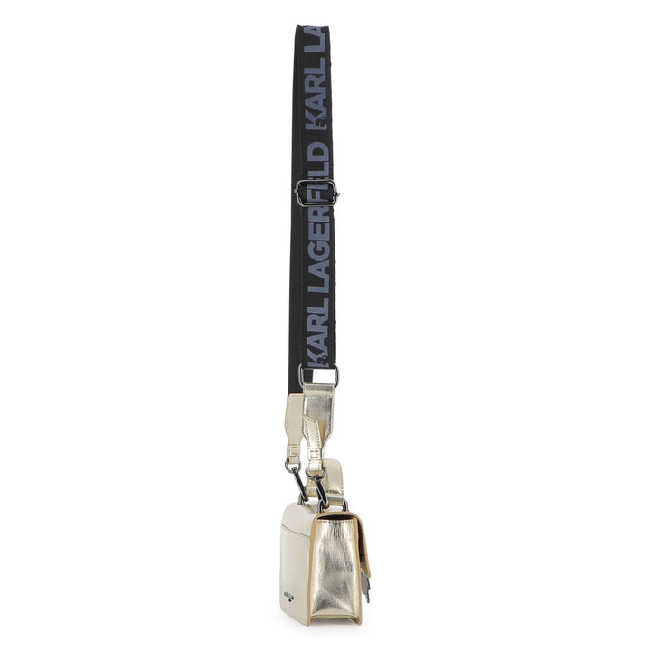 Baby girls gold handbag featuring a stylish logo strap, adding a touch of elegance to any outfit.