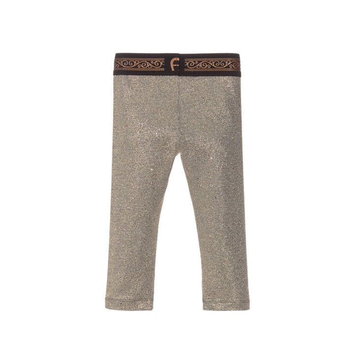Eye-catching glittery gold full-length leggings for baby girls by AIGNER. Lightweight and stretchy, the contrasting black elasticated waistband is printed with bronze rubberised signature 'A' horseshoe logos and ornate borders for an added branded touch.