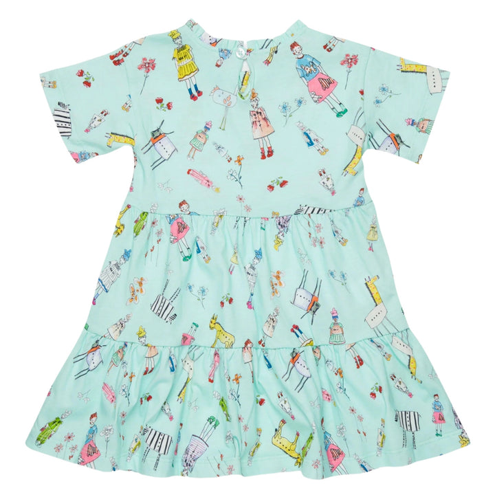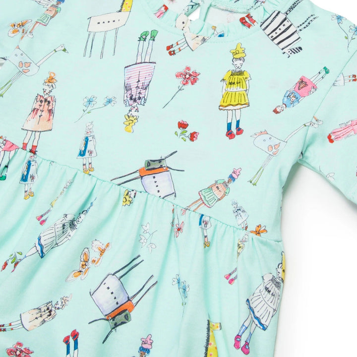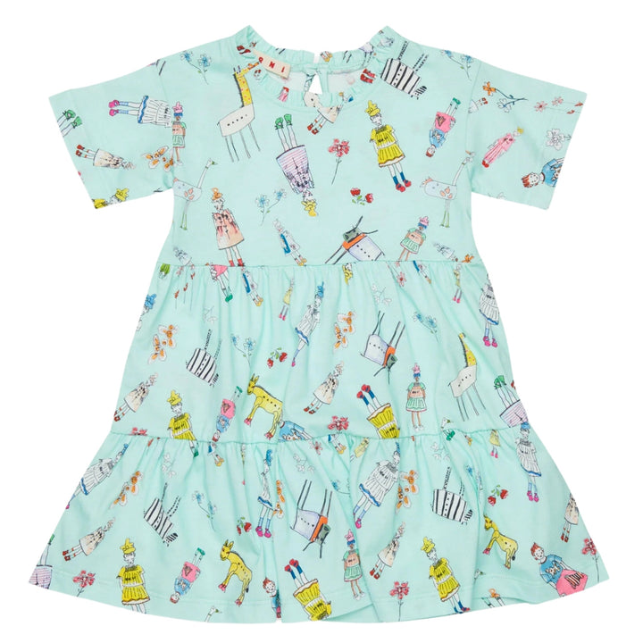 Short-sleeved dress in jersey with Rainbow Day all-over print. Ruffles on crew-neck. Ruffles along the garment. Drop closure on back. Made of cotton. Any differences between the garment photographed and the one you will receive are a symbol of the fi