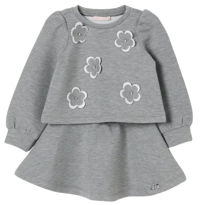 This adorable grey skirt set is adorned with delicate flower-patch details, adding a sweet and stylish charm to your baby girls outfit. Made from a soft blend of polyester, viscose, and elastane, it offers a comfortable stretch fit and a smooth feel, perfect for both casual wear and special occasions.