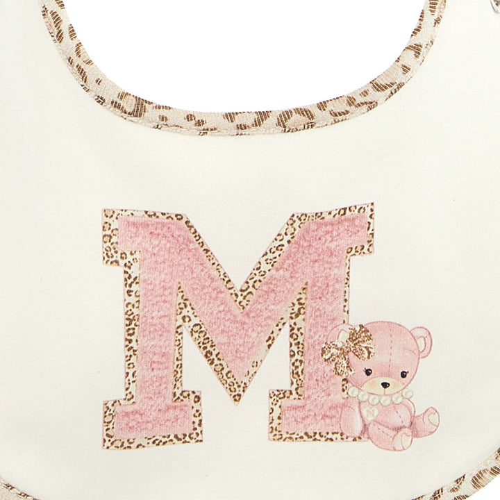 Ivory bib for baby girls by Italian brand Monnalisa, made in super soft cotton jersey. Fastening with adjustable popper closures, this leopard print trimmed bib has a pink logo and sweet bear print on the front. The reverse side is made in absorbent