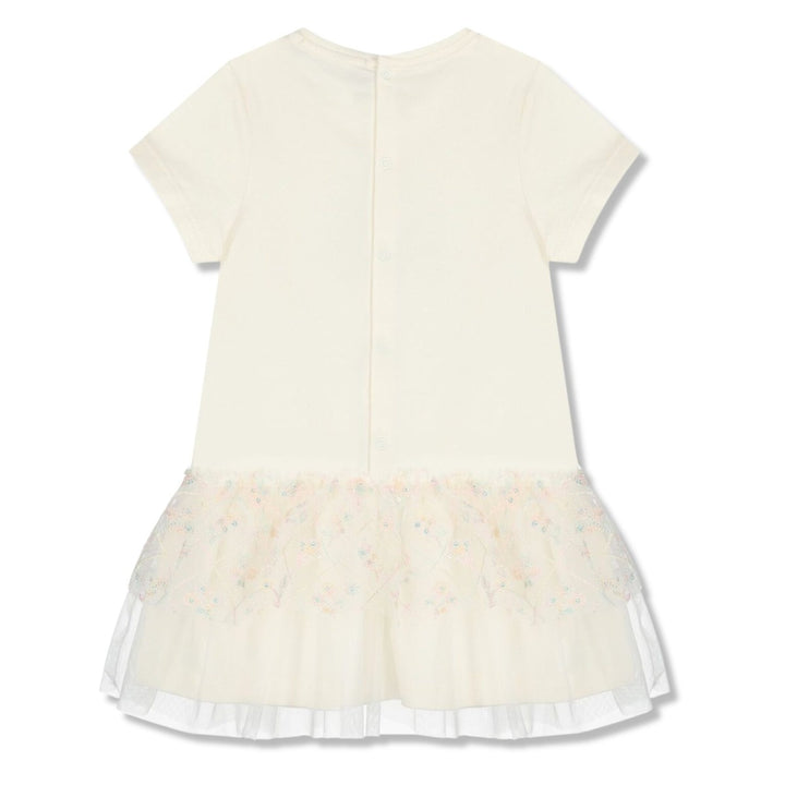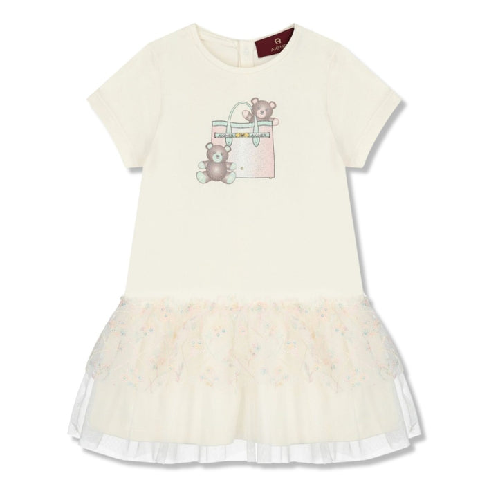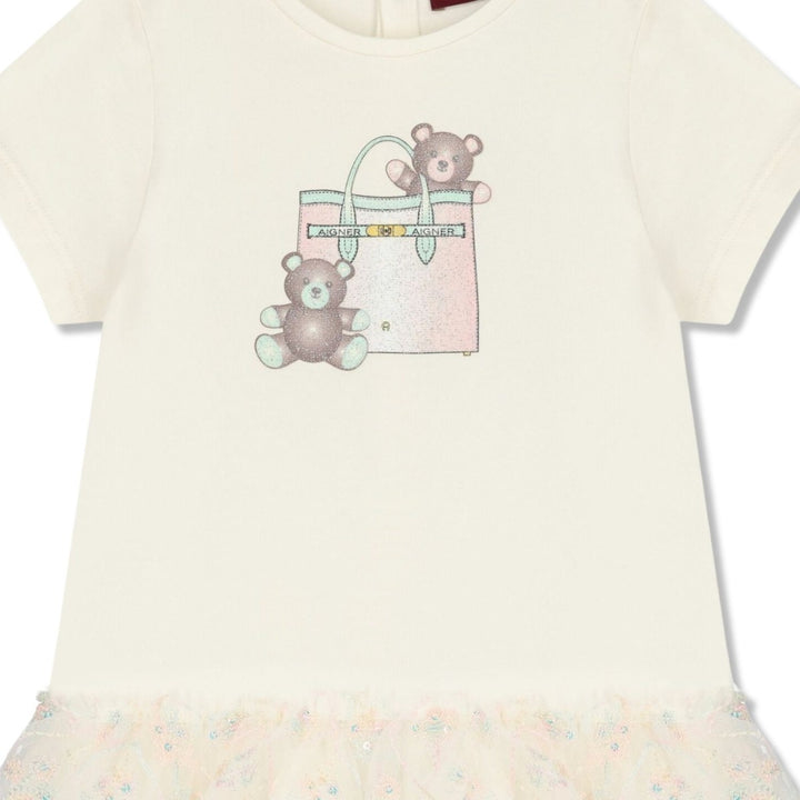 A pretty pale ivory dress for baby girls by AIGNER, made in comfortable cotton jersey. The bodice is printed with a sparkly logo-branded 'Farah' bag and two cute teddy bears. The skirt is trimmed with soft tulle, the top ruffle decorated with pastel-coloured floral embroidery and shiny sequins. There are easy-fastening poppers on the back.
