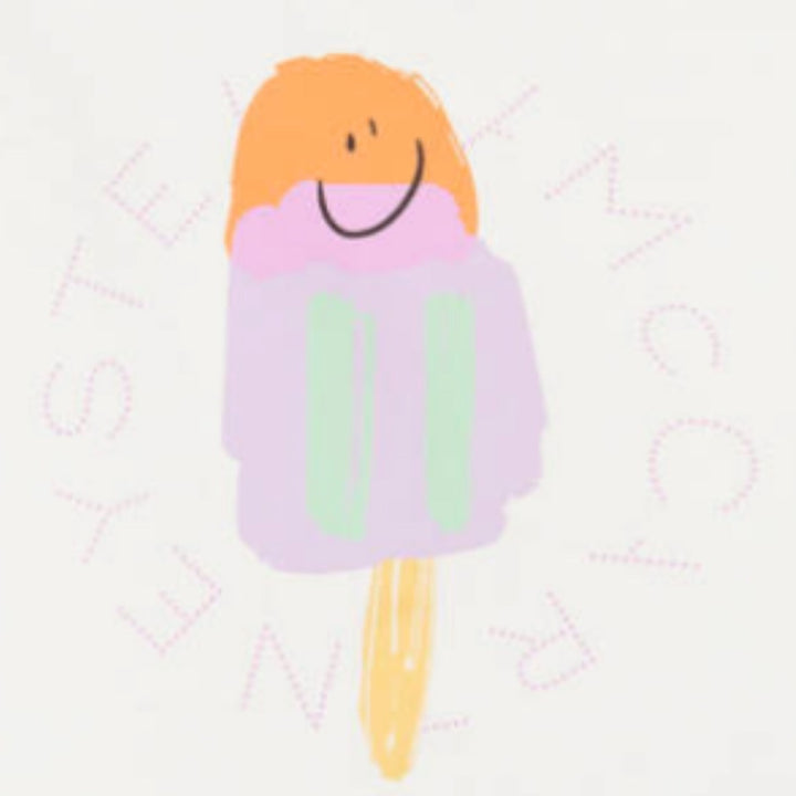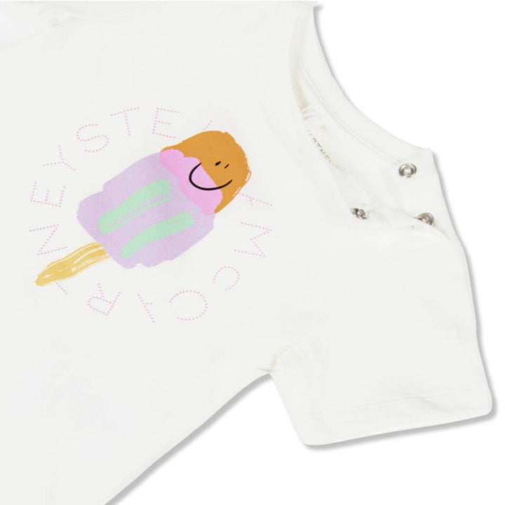 Ivory T-shirt for little girls by Stella McCartney Kids, made in comfortable organic cotton jersey. It has a cute and colourful ice lolly and logo design on the front, with poppers on one shoulder to help with dressing.