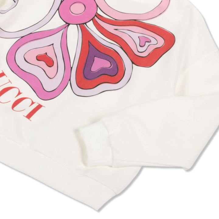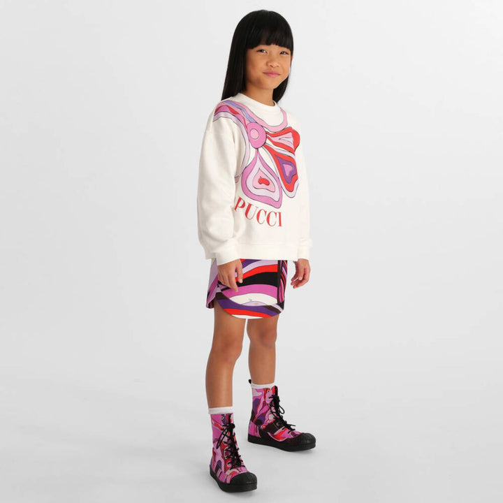 A standout ivory sweatshirt for girls by Italian label PUCCI from the Orchidee range, with a beautiful pink and purple heart print and a red logo below. Ideal for elevating casual outfits with designer style, it has a loose, drop-shouldered fit.